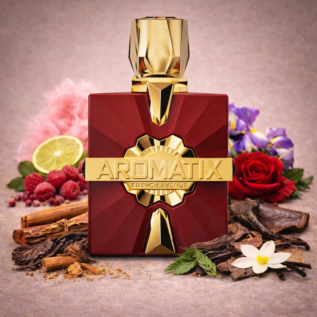 Carnal Desire by Aromatix X French Avenue opens with a bright yet spicy blend where raspberry and bergamot bring a juicy freshness, gently warmed by cinnamon. The heart reveals a sweet and floral character as airy cotton candy merges with soft orris and rose, creating a smooth and slightly powdery sweetness. As it settles, the fragrance deepens into a rich and sensual base where leather and oud are softened by creamy vanilla, earthy patchouli, and dry cedarwood, leaving a warm and indulgent trail.